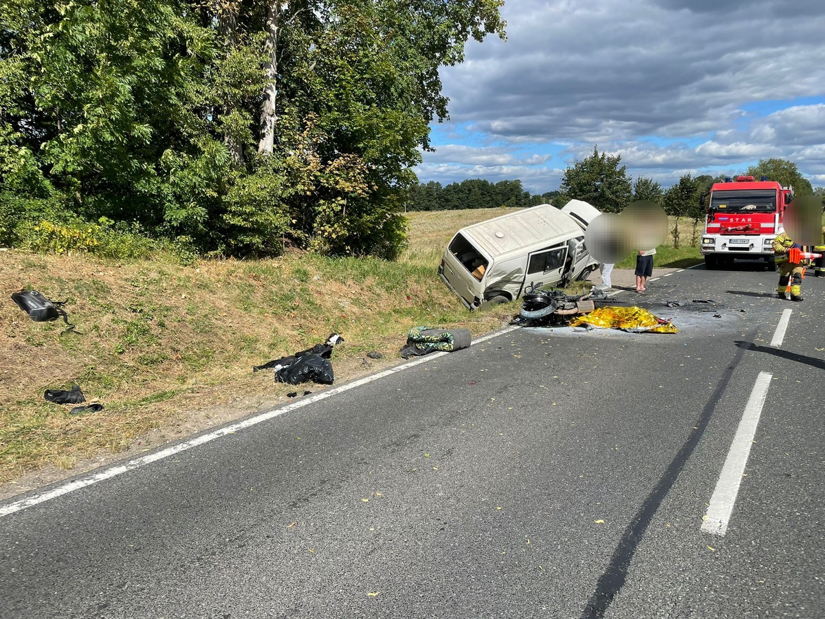 Nieustąpienie pierwszeństwa było również najprawdopodobniej przyczyną groźnego wypadku, jaki miał miejsce chwilę później na drodze krajowej nr 59 w miejscowości Muntowo. Ze wstępnych ustaleń policjantów pracujących przy obsłudze tego zdarzenia wynika, że mężczyzna kierujący busem marki volkswagen, wykonując manewr skrętu w lewo na pole, nie ustąpił pierwszeństwa przejazdu dla prawidłowo jadącego motocykla, doprowadzając do zderzenia pojazdów. W wyniku tego zdarzenia 20-letni motocyklista został przetransportowany śmigłowcem Lotniczego Pogotowia Ratunkowego do szpitala, gdzie okazało się, że doznał obrażeń powodujących rozstrój zdrowia powyżej 7 dni. Osoby podróżujące busem nie doznały poważnych obrażeń, a kierujący był trzeźwy. Policjanci wyjaśniają wszelkie okoliczności tego wypadku.