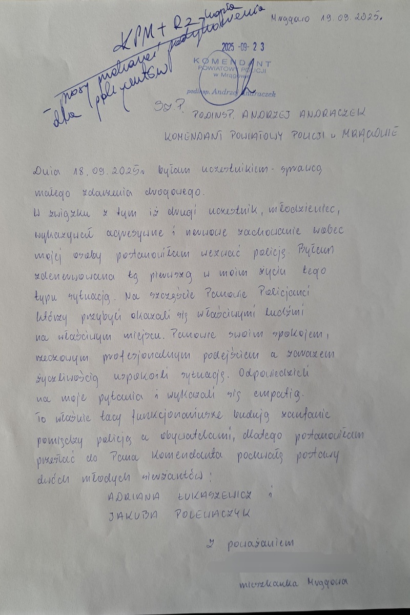Na ręce Komendanta Powiatowego Policji w Mrągowie wpłynęły podziękowania od kobiety, która spowodowała kolizję. W swoim liście doceniła ona nie tylko profesjonalizm, ale również empatię i życzliwość interweniujących policjantów. Jak podkreśliła, funkcjonariusze odpowiadali na wszystkie pytania uczestników zdarzenia, okazując cierpliwość i troskę. Według autorki podziękowań, właśnie takie postawy policjantów budują zaufanie między służbami a obywatelami.