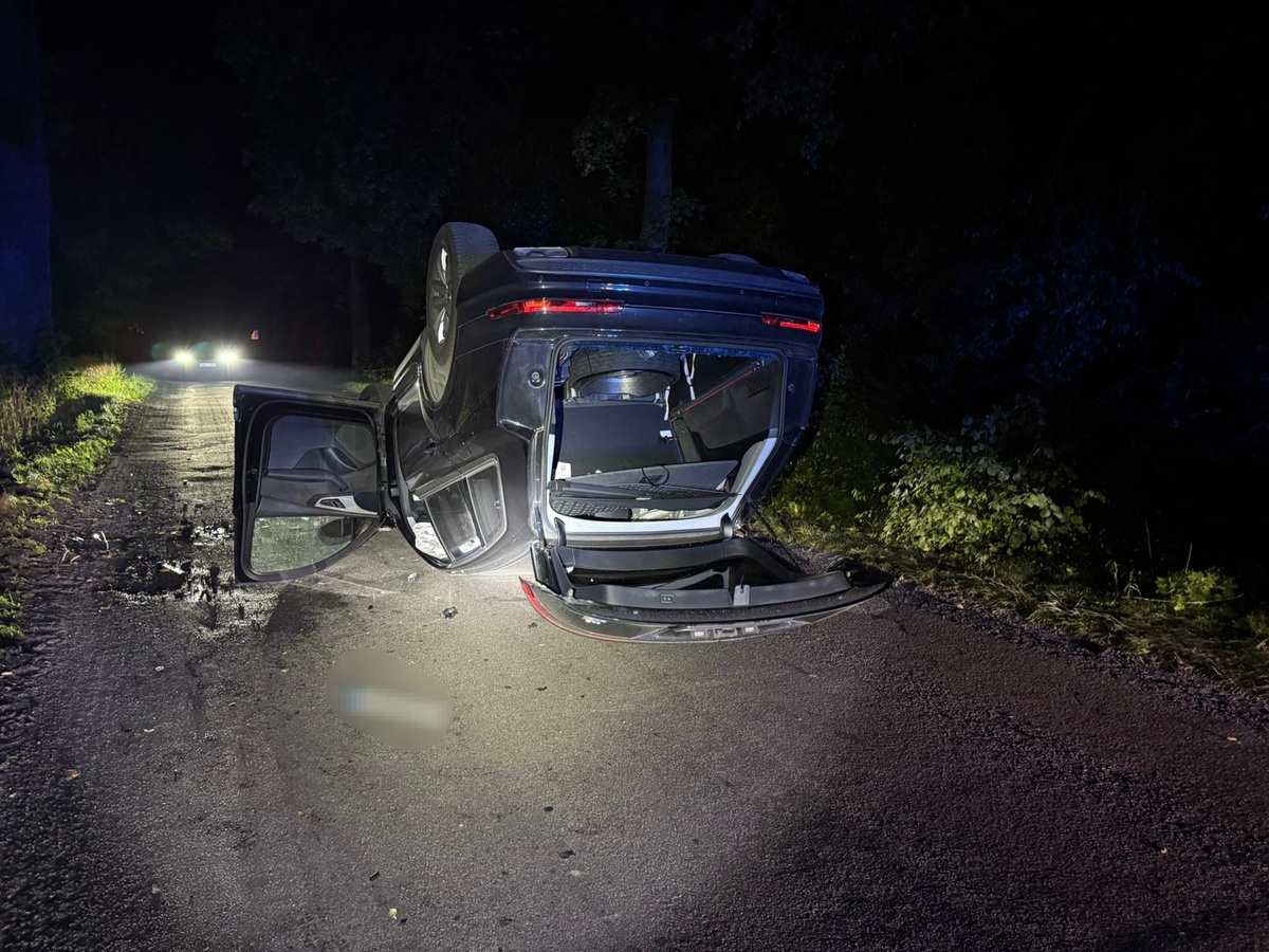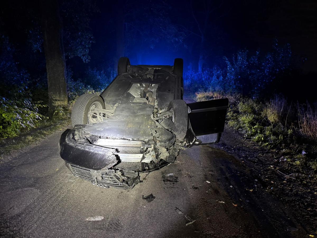 W piątek (03.10.2025 r.) po godz. 22:00 na numer alarmowy wpłynęło wysłane z pojazdu automatyczne zgłoszenie o zdarzeniu drogowym w okolicy miejscowości Lembruk. We wskazane miejsce niezwłocznie zostali skierowani funkcjonariusze, którzy zastali tam 36-letniego kierującego oraz pojazd audi przewrócony na dach. Z relacji kierującego wynikało, że chcąc uniknąć zderzenia z sarną, która wybiegła na jezdnię, zjechał na pobocze, uderzając w przydrożne drzewo, a następnie doszło do wywrócenia się pojazdu na dach. Na szczęście kierujący nie doznał poważnych obrażeń.