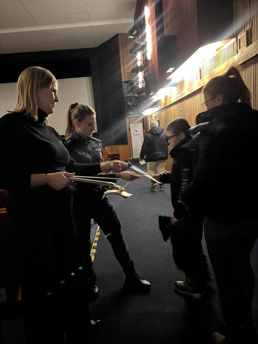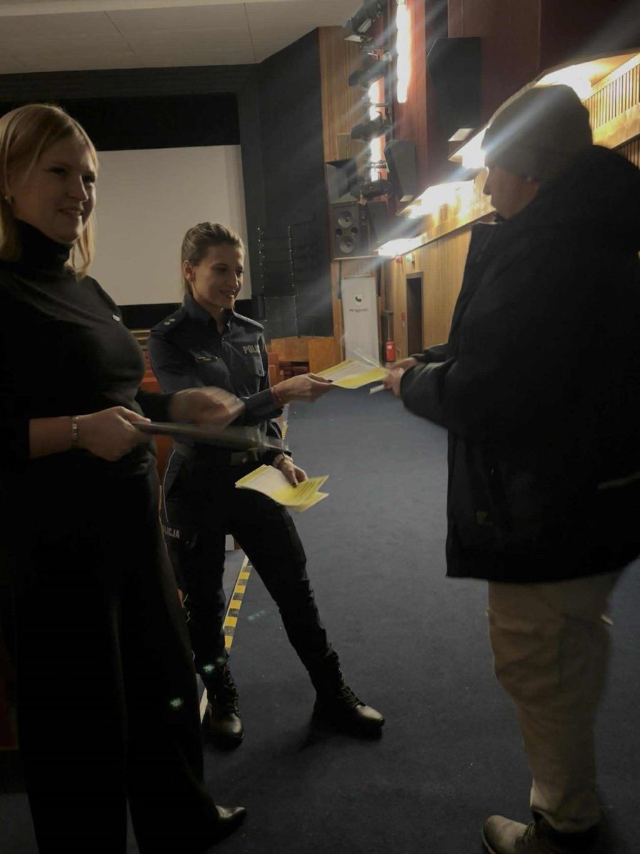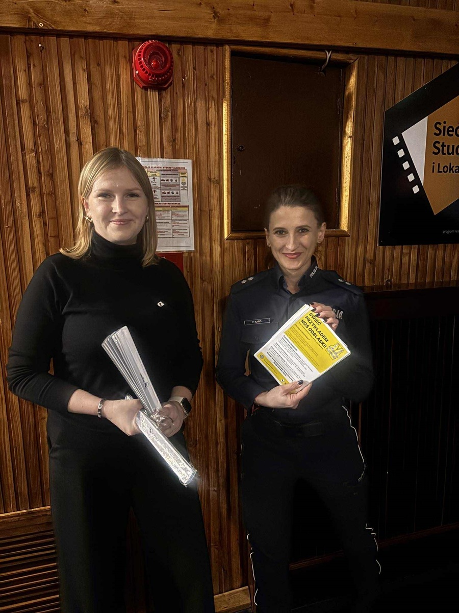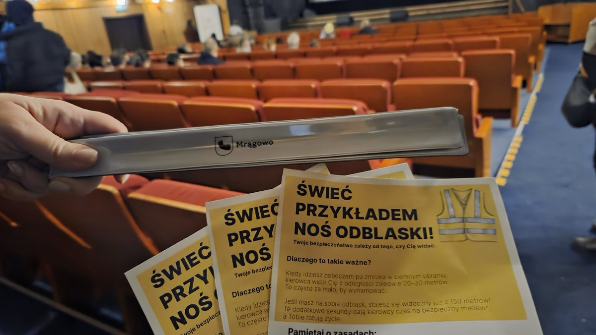 Funkcjonariusze Komendy Powiatowej Policji w Mrągowie chętnie angażują się w inicjatywy profilaktyczne, które mają bezpośredni wpływ na bezpieczeństwo mieszkańców, zwłaszcza w zakresie bezpieczeństwa w ruchu drogowym oraz poprawy widoczności pieszych po zmroku. Jedna z takich akcji odbyła się w sobotę (31.01.2026 r.) z inicjatywy Urzędu Miejskiego w Mrągowie. Policjantka, wspólnie z przedstawicielką urzędu, rozdawały elementy odblaskowe oraz materiały informacyjne osobom uczestniczącym w seansie filmowym. Działania były skierowane do widzów opuszczających kino po zapadnięciu zmroku.