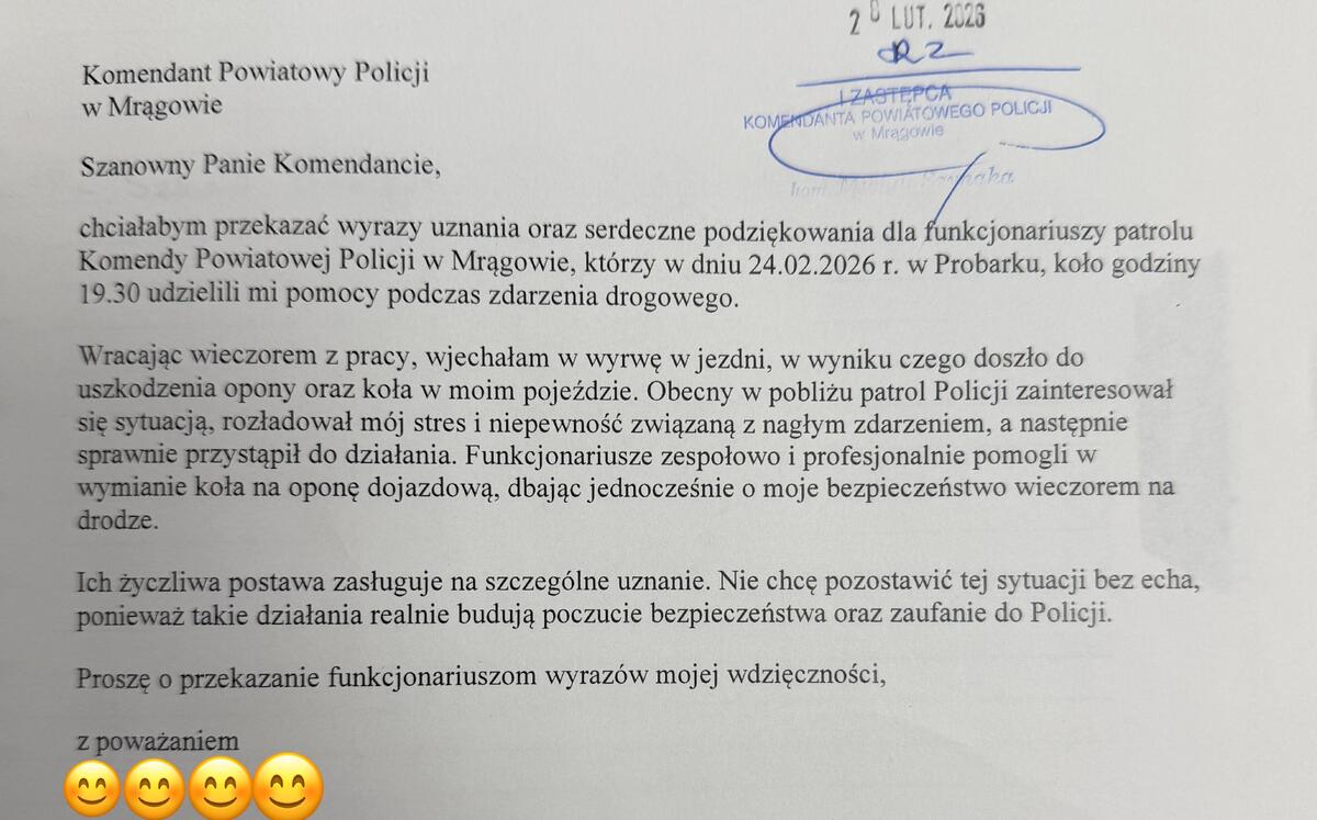 Na ręce Komendanta Powiatowego Policji w Mrągowie wpłynęły podziękowania za profesjonalizm i życzliwość policjantów Wydziału Ruchu Drogowego Komendy Powiatowej Policji w Mrągowie. Niezmiernie miło, kiedy codzienna służba na rzecz bezpieczeństwa mieszkańców powiatu mrągowskiego jest doceniana przez obywateli.