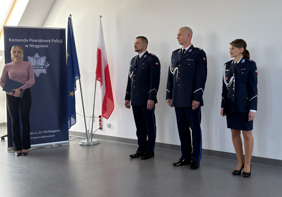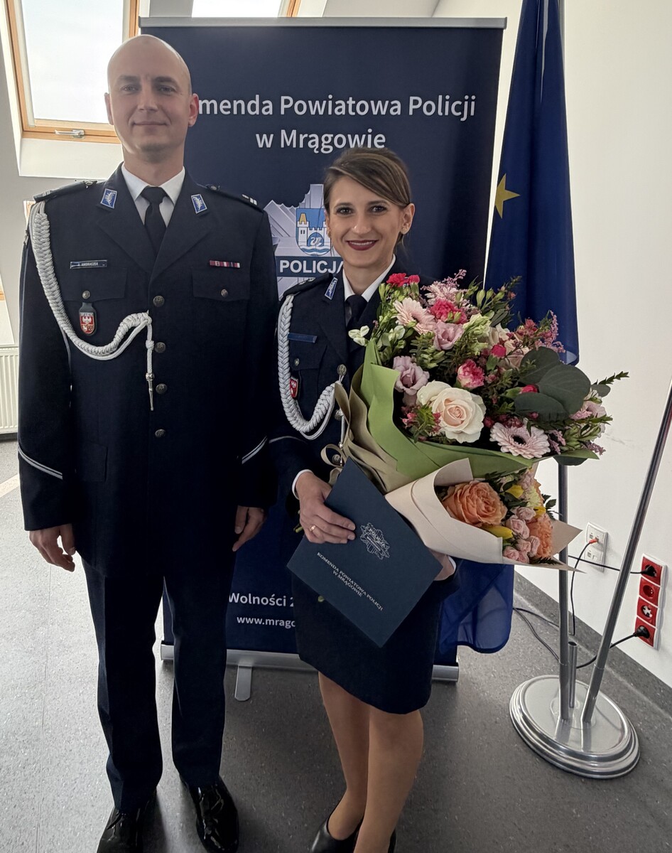 Od 18 lutego 2026 r. podkomisarz Paulina Karo pełniła obowiązki Komendanta Komisariatu Policji w Mikołajkach. We wtorek (31.03.2026 r.) o godz. 10:00 w sali odpraw Komendy Powiatowej Policji w Mrągowie odbyła się uroczysta zbiórka, podczas której Pani Komendant została oficjalnie powołana na stanowisko Komendanta Komisariatu Policji w Mikołajkach. W uroczystości uczestniczył Komendant Powiatowy Policji w Mrągowie podinsp. Andrzej Andraczek, który w obecności kadry kierowniczej, policjantów, pracowników cywilnych oraz Pana Burmistrza Miasta Mikołajki Piotra Jakubowskiego wręczył podkom. Paulinie Karo rozkaz personalny o powołaniu jej na stanowisko Komendanta Komisariatu Policji w Mikołajkach. Podinsp. Andrzej Andraczek zaznaczył, że awans na stanowisko Komendanta podkom. Pauliny Karo stanowi wyraz uznania dla jej dotychczasowej służby, kompetencji oraz zaufania, jakim została obdarzona, a zarazem podkreśla rangę i odpowiedzialność powierzonych jej obowiązków.