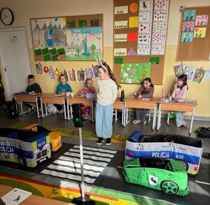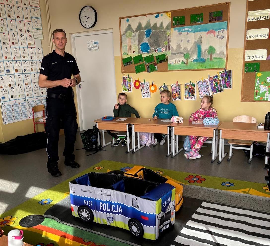 Korzystając z zaproszenia wychowawcy klasy pierwszej Szkoły Podstawowej im. I. Sendlerowej w Warpunach z siedzibą w Zyndakach policjant spotkał się z uczniami w ramach prowadzonych działań profilaktycznych dotyczących bezpieczeństwa na drodze. Podczas spotkania, dzieci wcieliły się w rolę policjantów i szukały małego pluszowego przestępcy, który ukrył się w sali.