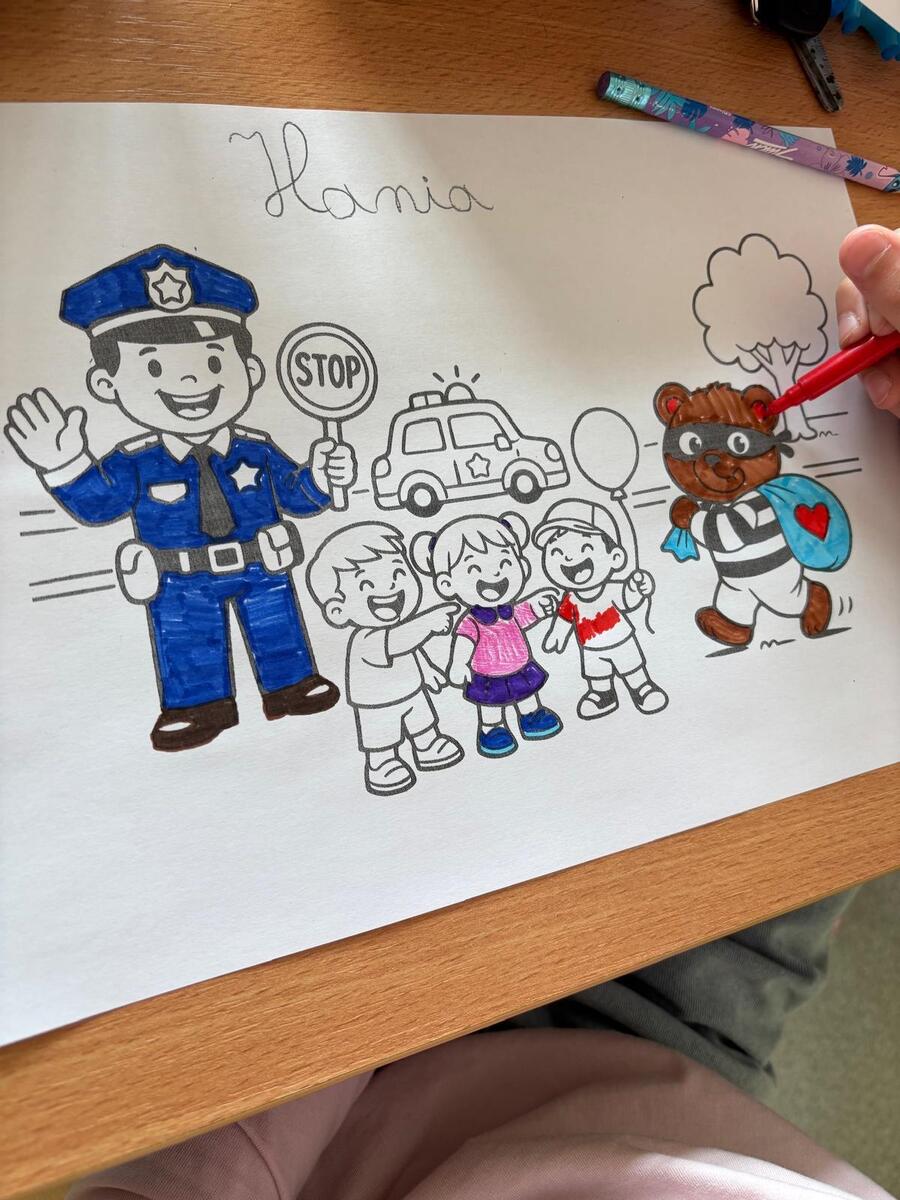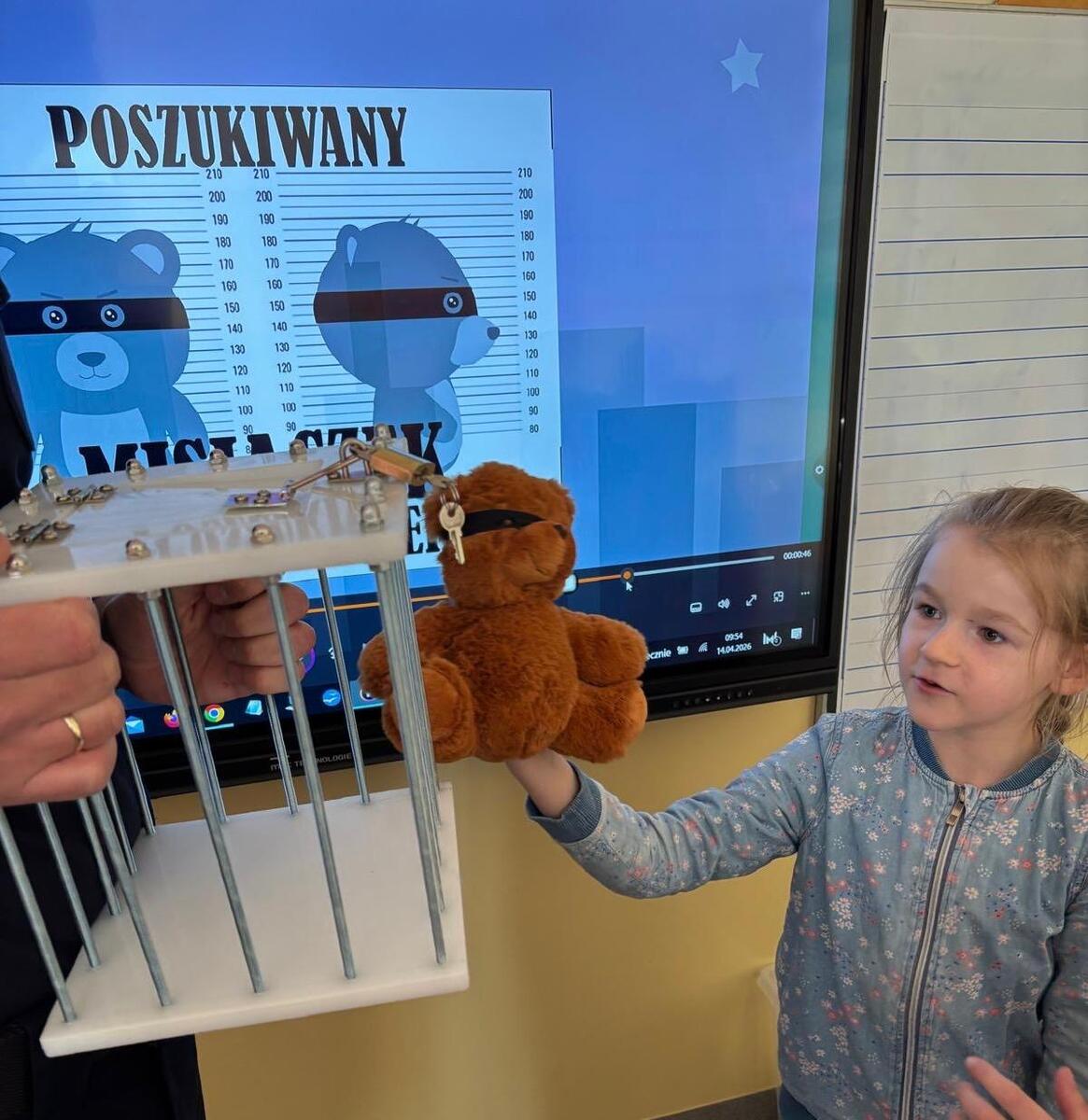 We wtorek (14.04.2026 r.) policjant z Komendy Powiatowej Policji w Mrągowie spotkał się z uczniami klasy pierwszej Szkoły Podstawowej im. I. Sendlerowej w Warpunach z siedzibą w Zyndakach. W ramach prowadzonych działań, funkcjonariusz rozmawiał z dziećmi o podstawowych zasadach bezpieczeństwa podczas poruszania się po drodze. Przypomniał jak należy prawidłowo przechodzić przez przejście dla pieszych oraz jakie zagrożenie niesie za sobą korzystanie z telefonów komórkowych i innych urządzeń w trakcie przechodzenia przez jezdnię. Dzieci aktywnie uczestniczyły w zajęciach i mogły skorzystać z zestawu „Autochodzik”. Najmłodsi mieli okazję poznać zawód policjanta, obejrzeć umundurowanie oraz sprzęt wykorzystywany przez policjantów w codziennej służbie. W nagrodę za świetną aktywność na zajęciach oraz duże zaangażowanie dzieci otrzymały od policjanta certyfikat daktyloskopijny, kolorowankę oraz model radiowozu policyjnego do samodzielnego wycięcia i sklejenia, a także miały okazję wcielić się w policjantów. Ich zadaniem było odnalezienie groźnego przestępcy- Misiaczka Rozrabiaczka, który ukrył się w sali. Zadanie to było dla dzieci nie lada wyzwaniem, które wyzwoliło w nich wiele pozytywnych emocji. Podczas spotkanie nie brakowało uśmiechu i świetnej zabawy. A jak powszechnie wiadomo, dzieci najlepiej się uczą poprzez zabawę.