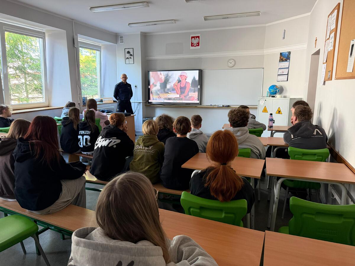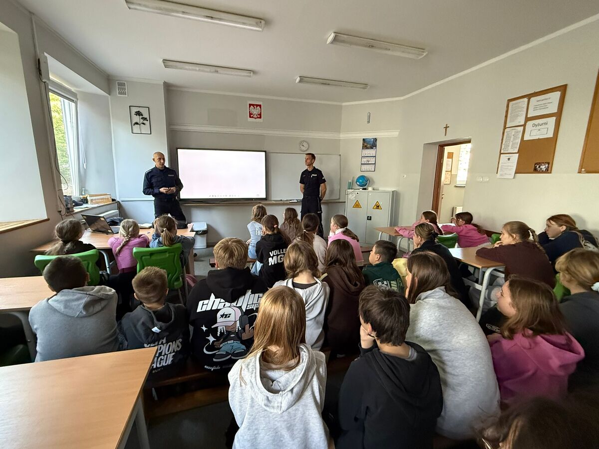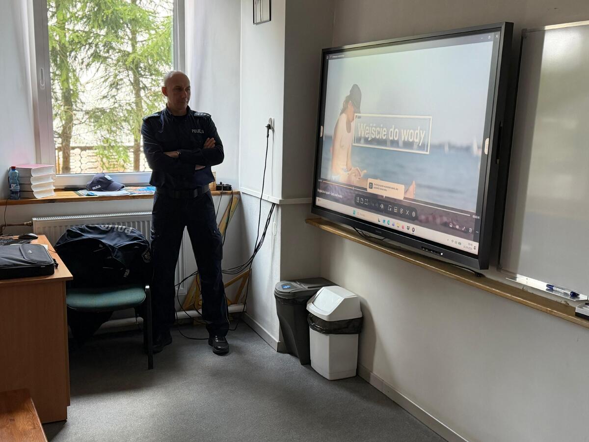 W czwartek (16.04.2026 r.) mrągowscy policjanci spotkali się z uczniami klas 4-8 Szkoły Podstawowej w Marcinkowie w ramach akcji „Aktywni Błękitni – szkoła przyjazna wodzie”. Głównym założeniem projektu jest wykształcenie wśród dzieci i młodzieży poprawnych nawyków i postaw, które wraz z otrzymaną wiedzą, w przyszłości będą mogły wykorzystywać i przekazywać dalej przyczyniając się do ochrony środowiska. W trakcie spotkania policjanci przekazali uczniom jak ważne jest dbanie o czystość i środowisko, a także sprzątanie po sobie przyniesionych nad wodę pustych opakowań, butelek, itp. Ponadto funkcjonariusze zaprezentowali film edukacyjny oraz omówili zasady bezpieczeństwa nad wodą w związku ze zbliżającym się okresem wakacyjnym. Ważnym elementem spotkania był również temat powiadamiania służb ratunkowych o zdarzeniach nad wodą oraz udzielania pierwszej pomocy przedmedycznej.