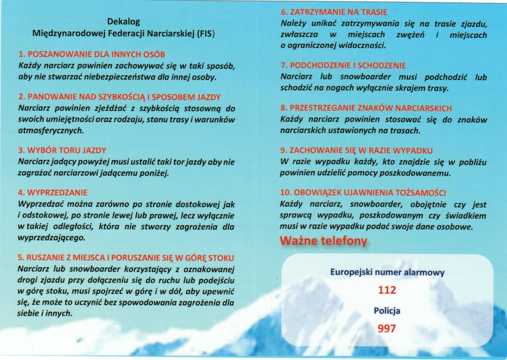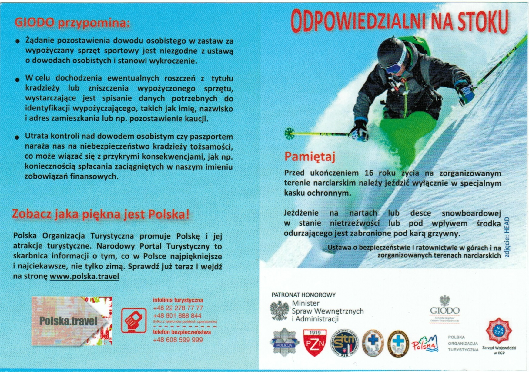 - Używajcie kasków podczas jazdy na nartach, do 16 roku życia jest to obowiązek na zorganizowanym stoku narciarskim (w innych miejscach oraz po ukończeniu 16 roku życia też nie zaszkodzi)