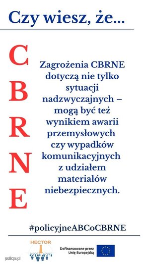 Skrót CBRNE oznacza realne zagrożenia, z którymi mierzą się służby na całym świecie, w tym także polska Policja. Aby przybliżyć tę tematykę od dzisiaj rozpoczynamy cykl artykułów sygnowanych wspólnym hasztagiem #policyjneABCoCBRNE. Postaramy się wyjaśnić w przystępny sposób, czym są zagrożenia chemiczne, biologiczne, radiacyjne, nuklearne i te związane z materiałami wybuchowymi. Przybliżymy, jak Policja, wspólnie z innymi służbami, dba o bezpieczeństwo nas wszystkich.
