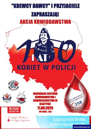 W 2025 roku obchodzimy 100-lecie kobiet w Polskiej Policji. Świętować można na różne sposoby. Jednym z nich jest pomoc potrzebującym. Klub HDK „Krewcy dawcy” zaprasza wszystkich chętnych do udziału w akcji honorowego oddawania krwi, zorganizowanej z tej okazji. Akcja odbędzie się w czwartek 11 września 2025 r. w Regionalnym Centrum Krwiodawstwa i Krwiolecznictwa w Olsztynie.